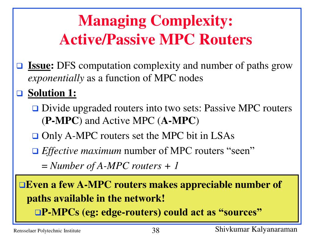 Managing Complexity: Active/Passive MPC Routers • Issue: DFS computation complexity and number of paths grow exponentially as a function of MPC nodes • Solution 1: • Divide upgraded routers into two sets: Passive MPC routers (P-MPC) and Active MPC (A-MPC) • Only A-MPC routers set the MPC bit in LSAs • Effectivemaximum number of MPC routers “seen” = Number of A-MPC routers + 1 • Even a few A-MPC routers makes appreciable number of paths available in the network! • P-MPCs (eg: edge-routers) could act as “sources”
