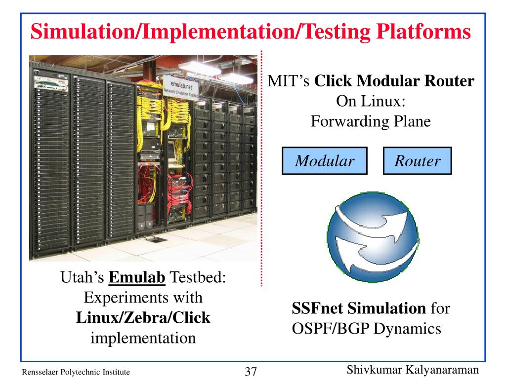 Simulation/Implementation/Testing Platforms MIT’s Click Modular Router On Linux: Forwarding Plane Modular Router Utah’s Emulab Testbed: Experiments with Linux/Zebra/Click implementation SSFnet Simulation for OSPF/BGP Dynamics