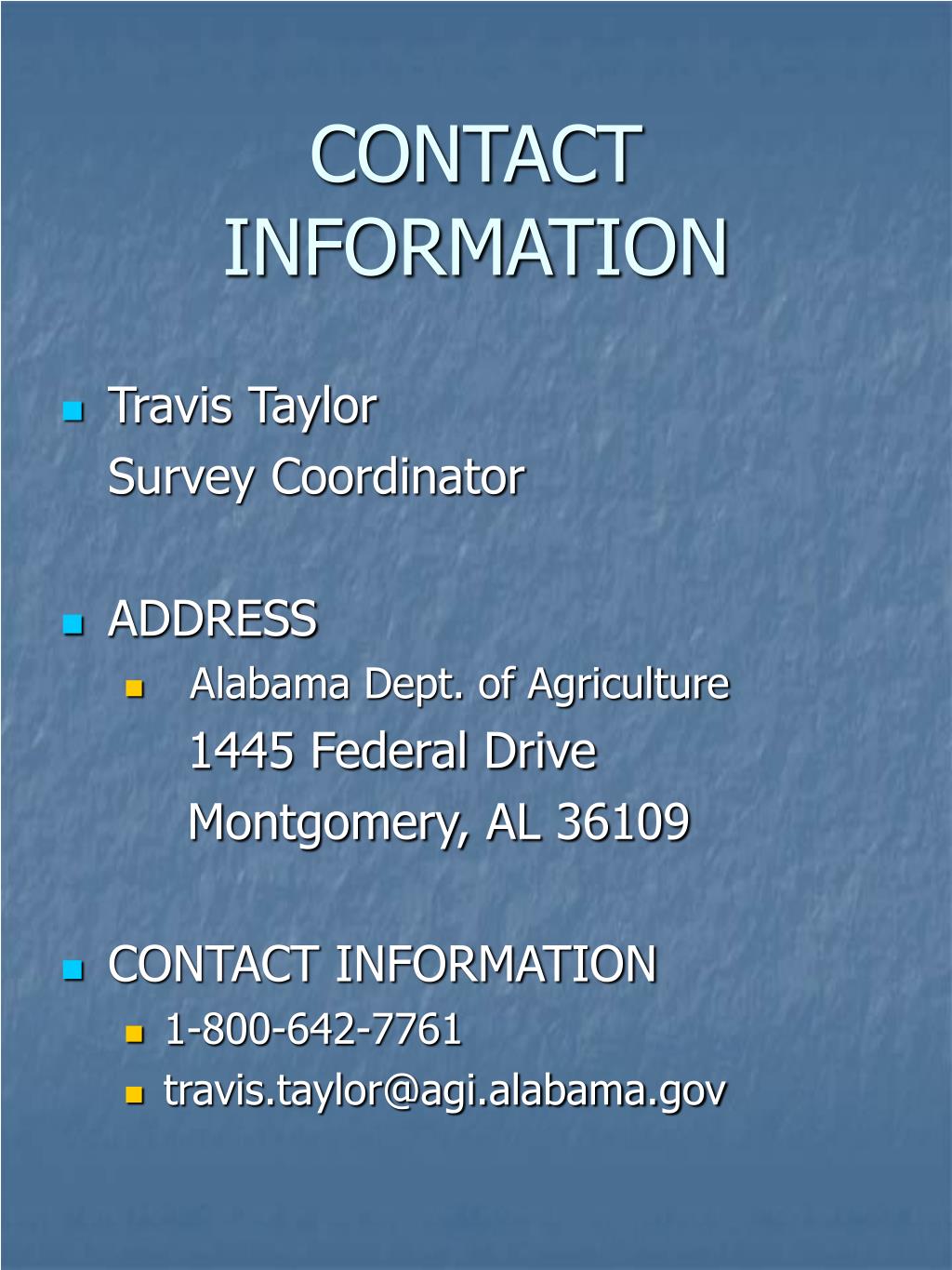 CONTACT INFORMATION • Travis Taylor Survey Coordinator • ADDRESS • Alabama Dept. of Agriculture 1445 Federal Drive Montgomery, AL 36109 • CONTACT INFORMATION • 1-800-642-7761 • travis.taylor@agi.alabama.gov