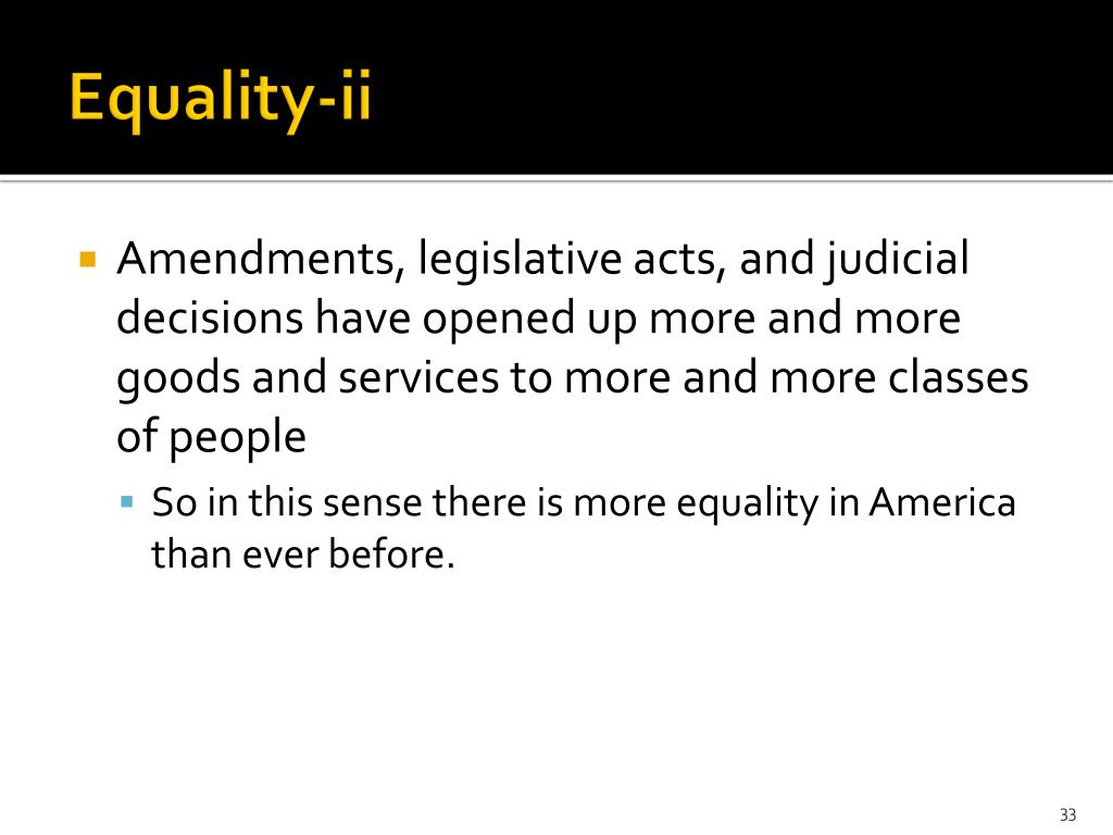 Equality-ii • Amendments, legislative acts, and judicial decisions have opened up more and more goods and services to more and more classes of people • So in this sense there is more equality in America than ever before.