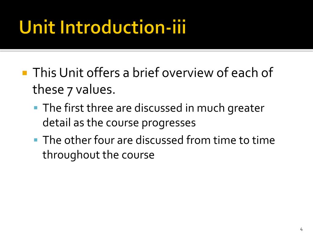 Unit Introduction-iii • This Unit offers a brief overview of each of these 7 values. • The first three are discussed in much greater detail as the course progresses • The other four are discussed from time to time throughout the course