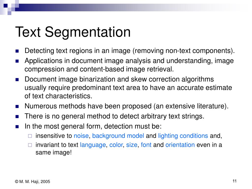 Text Segmentation • Detecting text regions in an image (removing non-text components). • Applications in document image analysis and understanding, image compression and content-based image retrieval. • Document image binarization and skew correction algorithms usually require predominant text area to have an accurate estimate of text characteristics. • Numerous methods have been proposed (an extensive literature). • There is no general method to detect arbitrary text strings. • In the most general form, detection must be: • insensitive to noise, background model and lighting conditions and, • invariant to text language, color, size, font and orientation even in a same image!