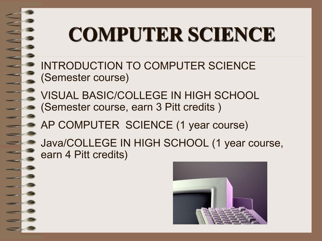 COMPUTER SCIENCE INTRODUCTION TO COMPUTER SCIENCE (Semester course) VISUAL BASIC/COLLEGE IN HIGH SCHOOL (Semester course, earn 3 Pitt credits ) AP COMPUTER SCIENCE (1 year course) Java/COLLEGE IN HIGH SCHOOL (1 year course, earn 4 Pitt credits)