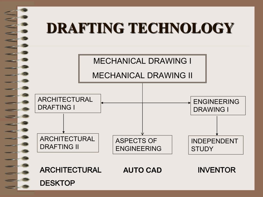 DRAFTING TECHNOLOGY MECHANICAL DRAWING I MECHANICAL DRAWING II ARCHITECTURAL DRAFTING I ENGINEERING DRAWING I ARCHITECTURAL DRAFTING II ASPECTS OF ENGINEERING INDEPENDENT STUDY ARCHITECTURAL DESKTOP AUTO CAD INVENTOR