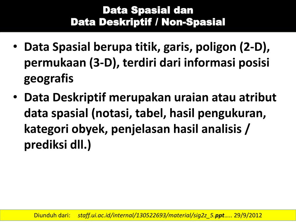 Data SpasialdanData Deskriptif / Non-Spasial • Data Spasialberupatitik, garis, poligon (2-D), permukaan (3-D), terdiridariinformasiposisigeografis • Data Deskriptifmerupakanuraianatauatribut data spasial(notasi, tabel, hasilpengukuran, kategoriobyek, penjelasanhasilanalisis / prediksidll.) Diunduhdari: staff.ui.ac.id/internal/130522693/material/sig2z_5.ppt….. 29/9/2012