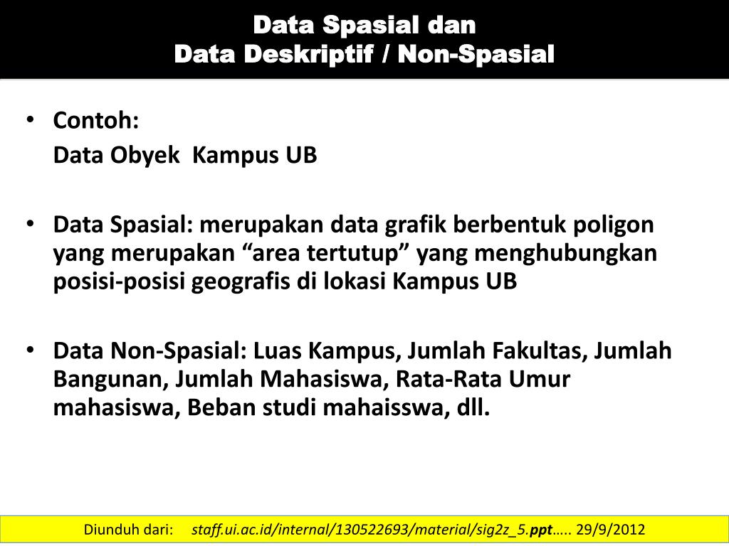 Data SpasialdanData Deskriptif / Non-Spasial • Contoh: Data ObyekKampus UB • Data Spasial: merupakan data grafikberbentukpoligon yang merupakan“area tertutup” yang menghubungkanposisi-posisigeografisdilokasiKampus UB • Data Non-Spasial: LuasKampus, JumlahFakultas, JumlahBangunan, JumlahMahasiswa, Rata-Rata Umurmahasiswa, Bebanstudimahaisswa, dll. Diunduhdari: staff.ui.ac.id/internal/130522693/material/sig2z_5.ppt….. 29/9/2012