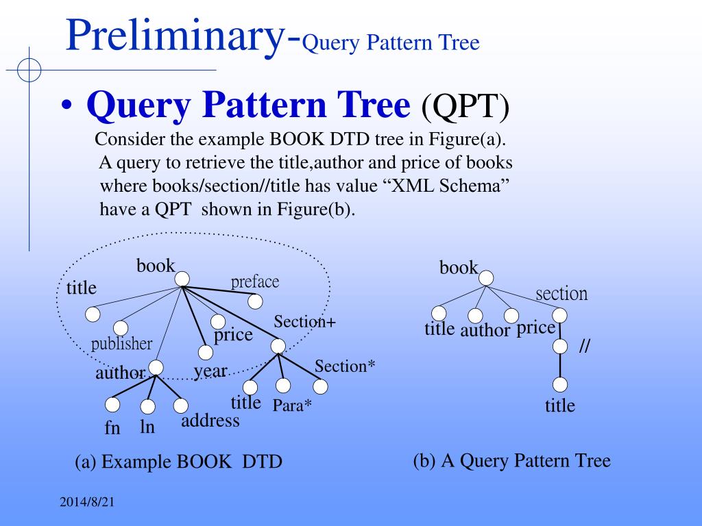 Preliminary-Query Pattern Tree • Query Pattern Tree (QPT) Consider the example BOOK DTD tree in Figure(a). A query to retrieve the title,author and price of books where books/section//title has value “XML Schema” have a QPT shown in Figure(b).
