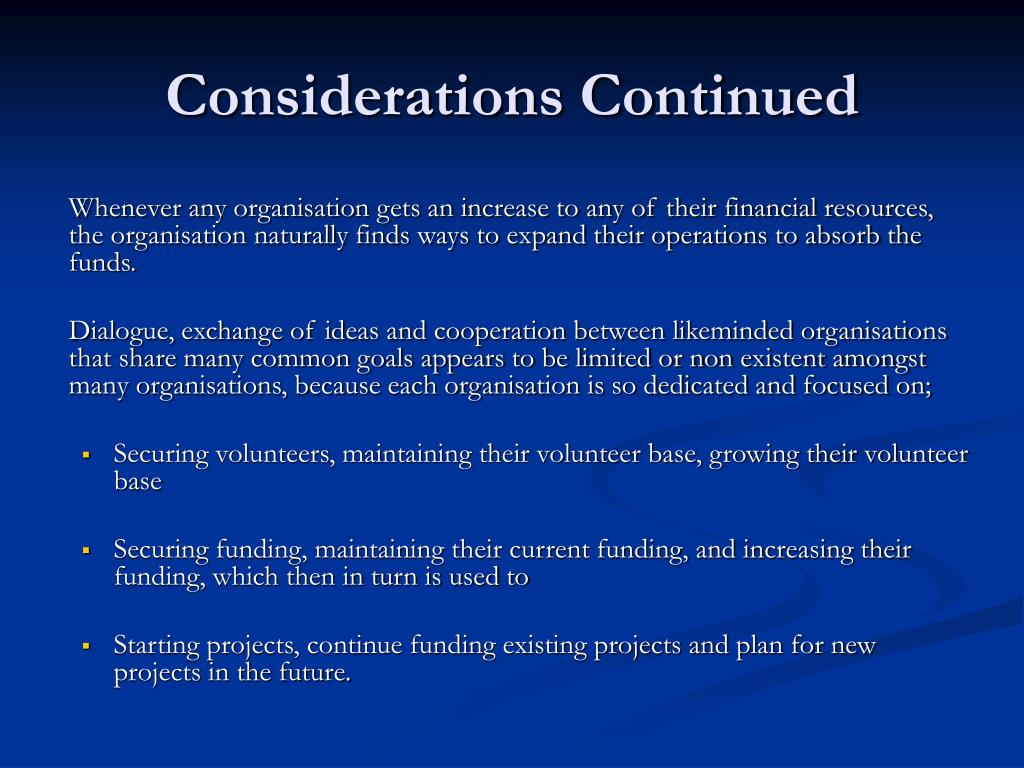Considerations Continued Whenever any organisation gets an increase to any of their financial resources, the organisation naturally finds ways to expand their operations to absorb the funds. Dialogue, exchange of ideas and cooperation between likeminded organisations that share many common goals appears to be limited or non existent amongst many organisations, because each organisation is so dedicated and focused on; • Securing volunteers, maintaining their volunteer base, growing their volunteer base • Securing funding, maintaining their current funding, and increasing their funding, which then in turn is used to • Starting projects, continue funding existing projects and plan for new projects in the future.