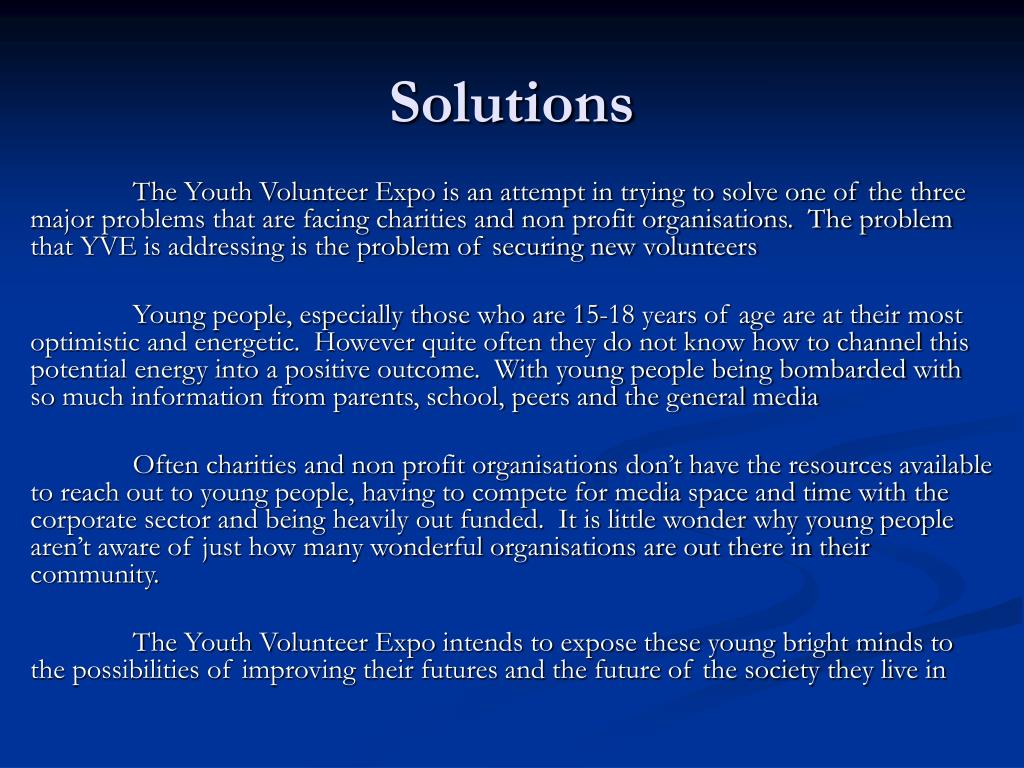 Solutions The Youth Volunteer Expo is an attempt in trying to solve one of the three major problems that are facing charities and non profit organisations. The problem that YVE is addressing is the problem of securing new volunteers Young people, especially those who are 15-18 years of age are at their most optimistic and energetic. However quite often they do not know how to channel this potential energy into a positive outcome. With young people being bombarded with so much information from parents, school, peers and the general media Often charities and non profit organisations don’t have the resources available to reach out to young people, having to compete for media space and time with the corporate sector and being heavily out funded. It is little wonder why young people aren’t aware of just how many wonderful organisations are out there in their community. The Youth Volunteer Expo intends to expose these young bright minds to the possibilities of improving their futures and the future of the society they live in