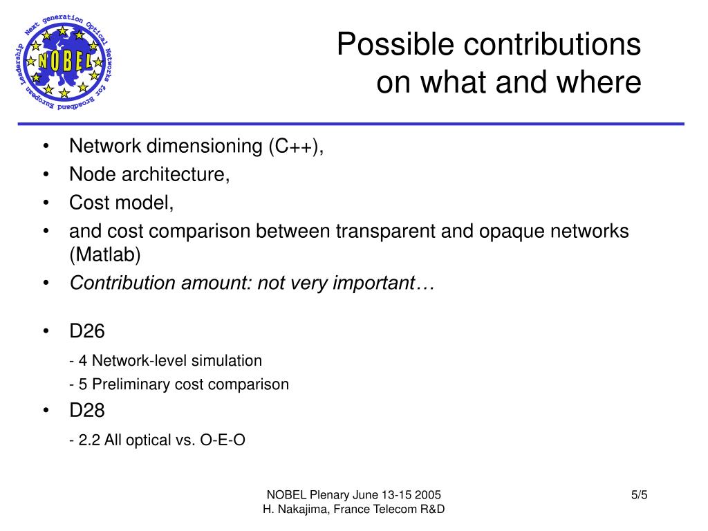 Possible contributionson what and where • Network dimensioning (C++), • Node architecture, • Cost model, • and cost comparison between transparent and opaque networks (Matlab) • Contribution amount: not very important… • D26 - 4 Network-level simulation - 5 Preliminary cost comparison • D28 - 2.2 All optical vs. O-E-O NOBEL Plenary June 13-15 2005 H. Nakajima, France Telecom R&D