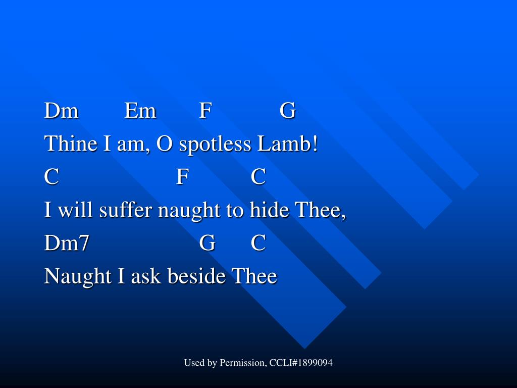Dm Em F G Thine I am, O spotless Lamb! C F C I will suffer naught to hide Thee, Dm7 G C Naught I ask beside Thee Used by Permission, CCLI#1899094