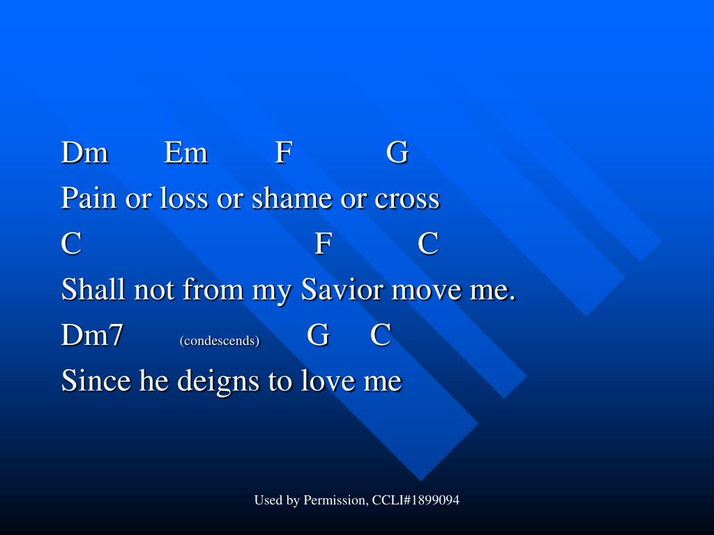 Dm Em F G Pain or loss or shame or cross C F C Shall not from my Savior move me. Dm7 (condescends) G C Since he deigns to love me Used by Permission, CCLI#1899094