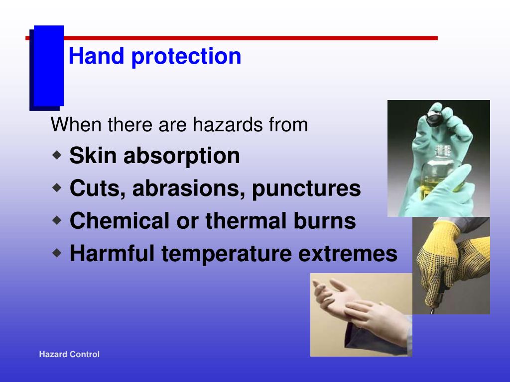 Hand protection When there are hazards from • Skin absorption • Cuts, abrasions, punctures • Chemical or thermal burns • Harmful temperature extremes