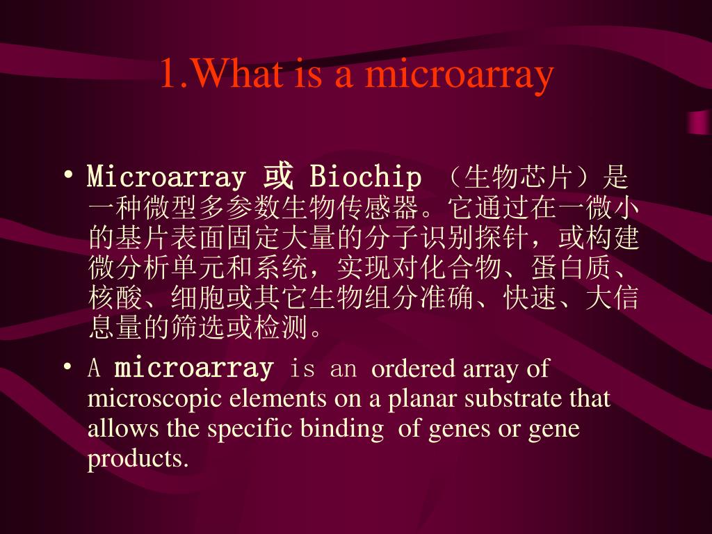 1.What is a microarray • Microarray 或 Biochip(生物芯片)是一种微型多参数生物传感器。它通过在一微小的基片表面固定大量的分子识别探针,或构建微分析单元和系统,实现对化合物、蛋白质、核酸、细胞或其它生物组分准确、快速、大信息量的筛选或检测。 • A microarray is an ordered array of microscopic elements on a planar substrate that allows the specific binding of genes or gene products.