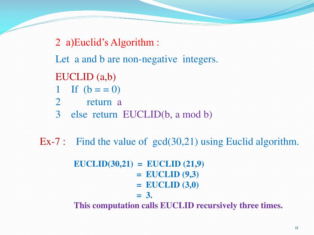2 a)Euclid’s Algorithm : Let a and b are non-negative integers. EUCLID (a,b) If (b = = 0) 2 return a 3 else return EUCLID(b, a mod b) Ex-7 : Find the value of gcd(30,21) using Euclid algorithm. EUCLID(30,21) = EUCLID (21,9) = EUCLID (9,3) = EUCLID (3,0) = 3. This computation calls EUCLID recursively three times.