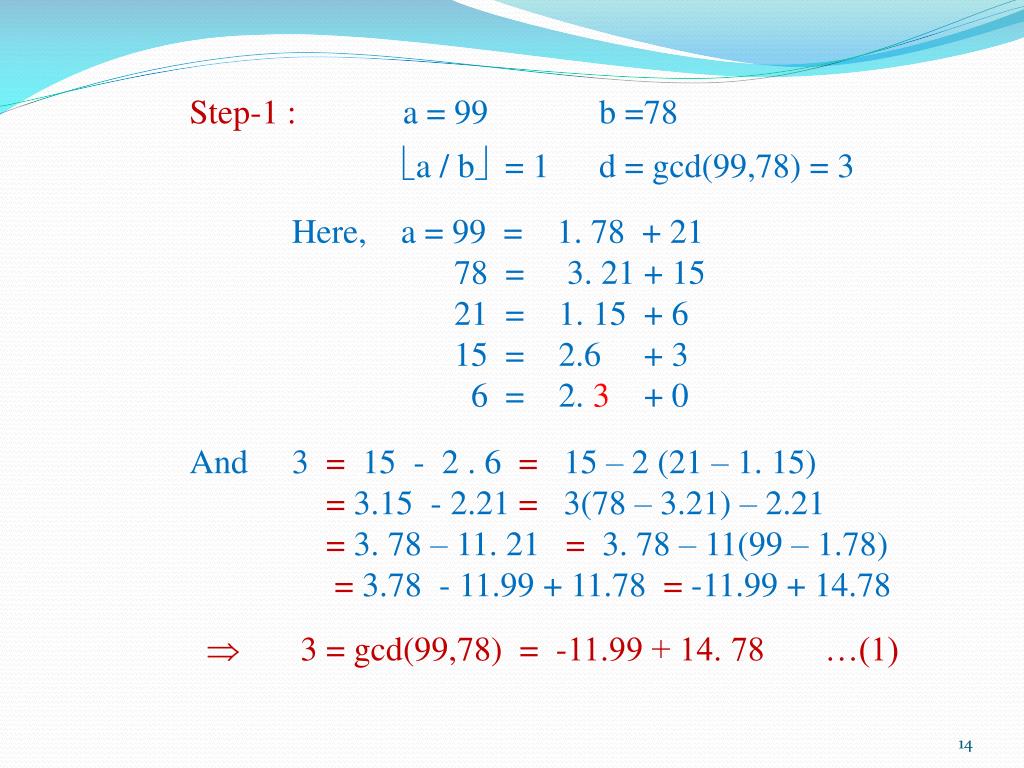 Step-1 : a = 99 b =78 a / b = 1 d = gcd(99,78) = 3 Here, a = 99 = 1. 78 + 21 78 = 3. 21 + 15 21 = 1. 15 + 6 15 = 2.6 + 3 6 = 2. 3 + 0 And 3 = 15 - 2 . 6 = 15 – 2 (21 – 1. 15) = 3.15 - 2.21 = 3(78 – 3.21) – 2.21 = 3. 78 – 11. 21 = 3. 78 – 11(99 – 1.78) = 3.78 - 11.99 + 11.78 = -11.99 + 14.78 3 = gcd(99,78) = -11.99 + 14. 78 …(1)