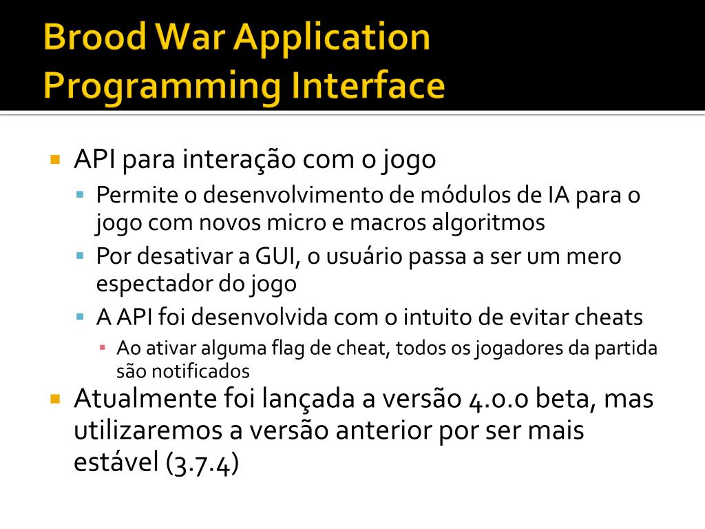 Brood War Application Programming Interface • API para interação com o jogo • Permite o desenvolvimento de módulos de IA para o jogo com novos micro e macros algoritmos • Por desativar a GUI, o usuário passa a ser um mero espectador do jogo • A API foi desenvolvida com o intuito de evitar cheats • Ao ativar alguma flag de cheat, todos os jogadores da partida são notificados • Atualmente foi lançada a versão 4.0.0 beta, mas utilizaremos a versão anterior por ser mais estável (3.7.4)