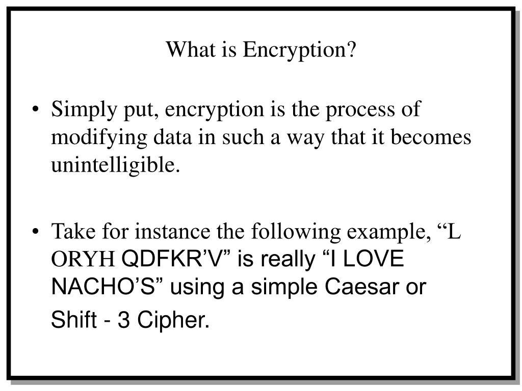 What is Encryption? • Simply put, encryption is the process of modifying data in such a way that it becomes unintelligible. • Take for instance the following example, “L ORYH QDFKR’V” is really “I LOVE NACHO’S” using a simple Caesar or Shift - 3 Cipher.