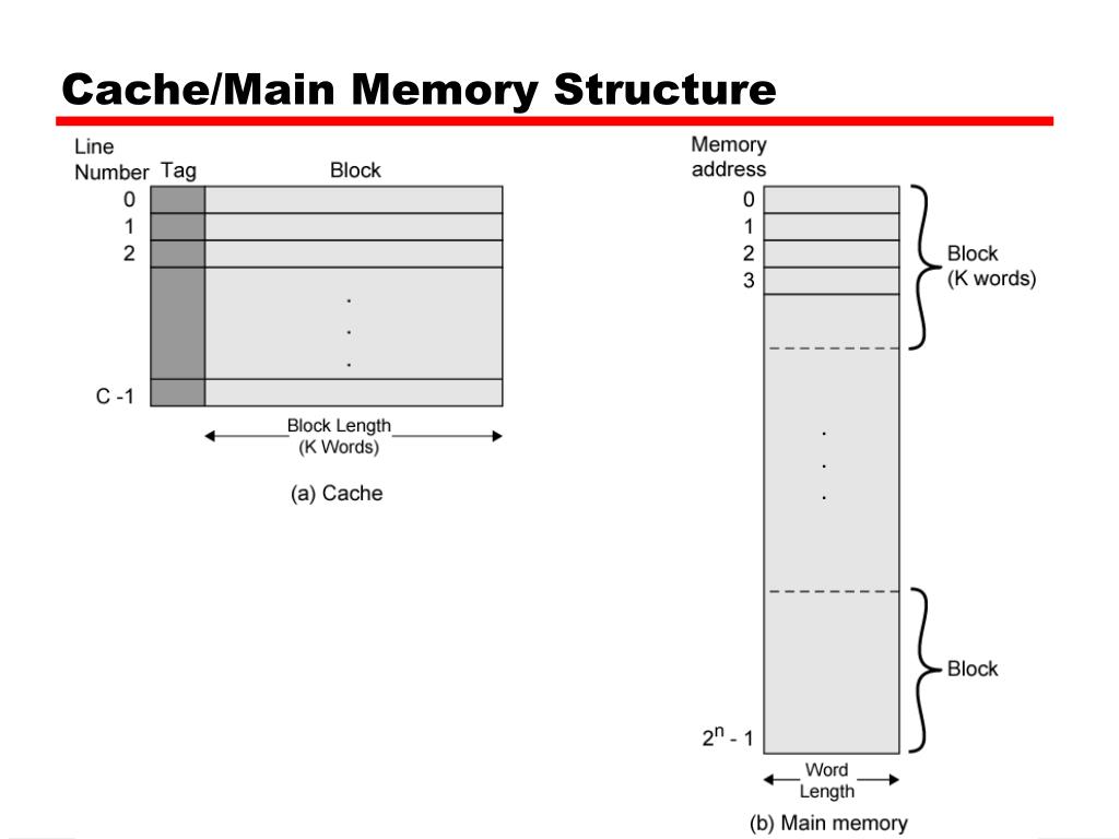 Cache operation – overview • CPU requests contents of memory location • Check cache for this data • If present, get from cache (fast) • If not present, read required block from main memory to cache • Then deliver from cache to CPU • Cache includes tags to identify which block of main memory is in each cache slot