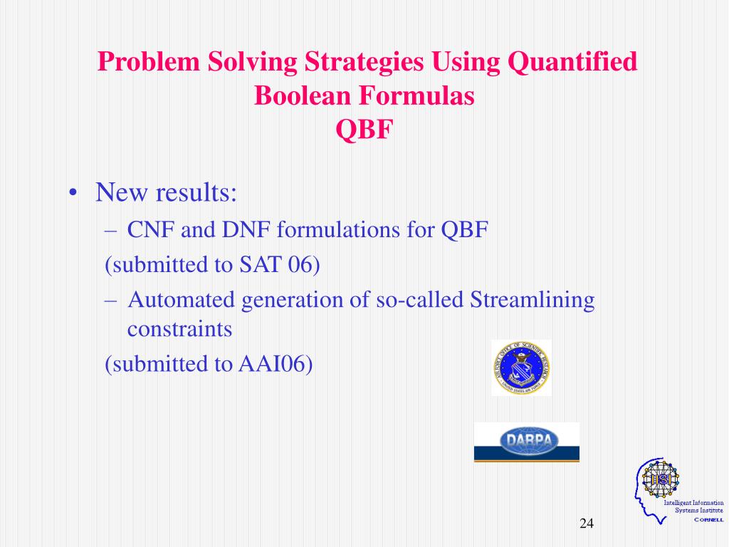 Problem Solving Strategies Using Quantified Boolean FormulasQBF • New results: • CNF and DNF formulations for QBF (submitted to SAT 06) • Automated generation of so-called Streamlining constraints (submitted to AAI06)