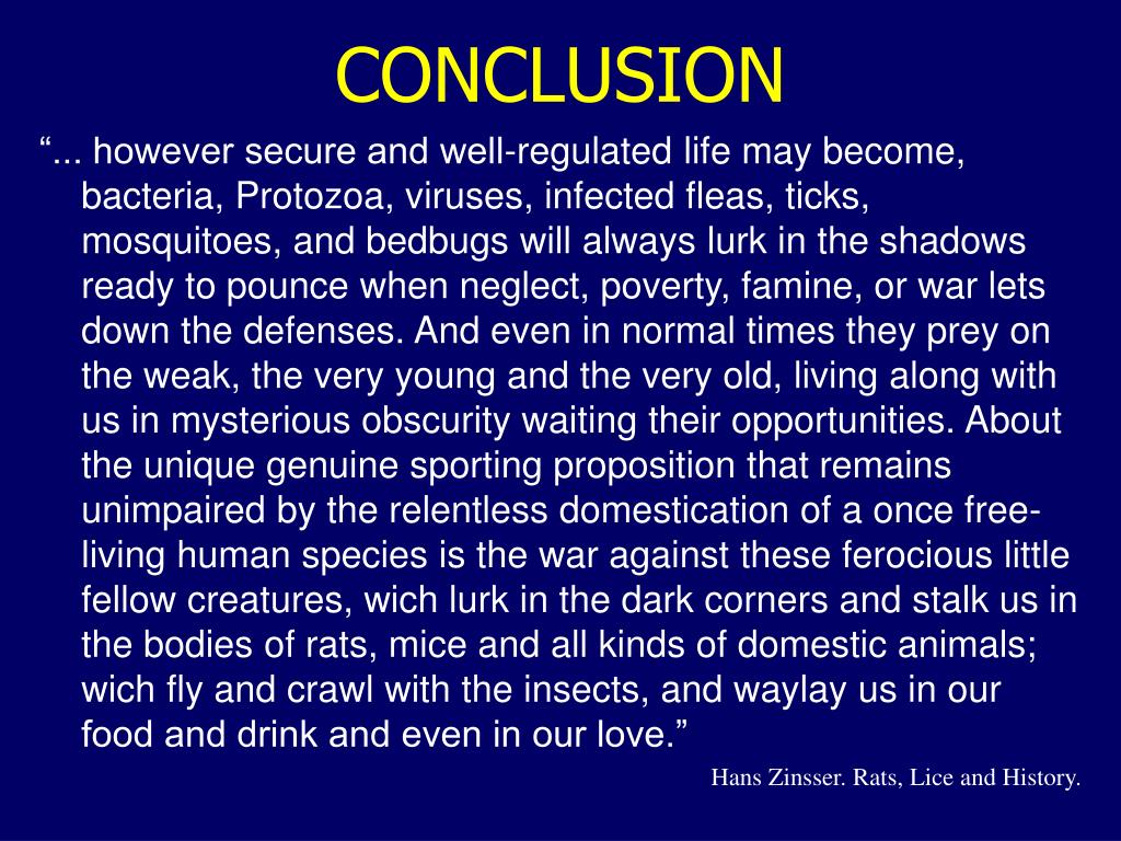 CONCLUSION “... however secure and well-regulated life may become, bacteria, Protozoa, viruses, infected fleas, ticks, mosquitoes, and bedbugs will always lurk in the shadows ready to pounce when neglect, poverty, famine, or war lets down the defenses. And even in normal times they prey on the weak, the very young and the very old, living along with us in mysterious obscurity waiting their opportunities. About the unique genuine sporting proposition that remains unimpaired by the relentless domestication of a once free-living human species is the war against these ferocious little fellow creatures, wich lurk in the dark corners and stalk us in the bodies of rats, mice and all kinds of domestic animals; wich fly and crawl with the insects, and waylay us in our food and drink and even in our love.” Hans Zinsser. Rats, Lice and History.