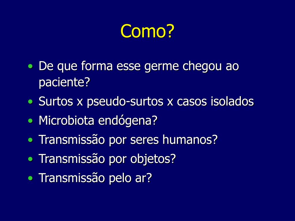 Como? • De que forma esse germe chegou ao paciente? • Surtos x pseudo-surtos x casos isolados • Microbiota endógena? • Transmissão por seres humanos? • Transmissão por objetos? • Transmissão pelo ar?