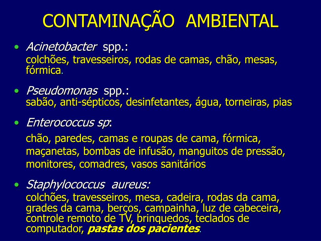 CONTAMINAÇÃO AMBIENTAL • Acinetobacter spp.: colchões, travesseiros, rodas de camas, chão, mesas, fórmica. • Pseudomonas spp.: sabão, anti-sépticos, desinfetantes, água, torneiras, pias • Enterococcus sp: chão, paredes, camas e roupas de cama, fórmica, maçanetas, bombas de infusão, manguitos de pressão, monitores, comadres, vasos sanitários • Staphylococcus aureus: colchões, travesseiros, mesa, cadeira, rodas da cama, grades da cama, berços, campainha, luz de cabeceira, controle remoto de TV, brinquedos, teclados de computador, pastas dos pacientes.