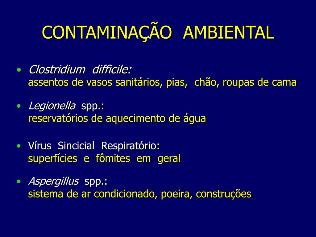 CONTAMINAÇÃO AMBIENTAL • Clostridium difficile: assentos de vasos sanitários, pias, chão, roupas de cama • Legionella spp.: reservatórios de aquecimento de água • Vírus Sincicial Respiratório: superfícies e fômites em geral • Aspergillus spp.: sistema de ar condicionado, poeira, construções