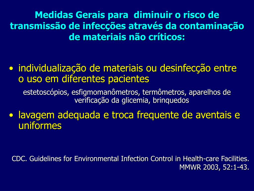Medidas Gerais para diminuir o risco de transmissão de infecções através da contaminação de materiais não críticos: • individualização de materiais ou desinfecção entre o uso em diferentes pacientes estetoscópios, esfigmomanômetros, termômetros, aparelhos de verificação da glicemia, brinquedos • lavagem adequada e troca frequente de aventais e uniformes CDC. Guidelines for Environmental Infection Control in Health-care Facilities. MMWR 2003, 52:1-43.
