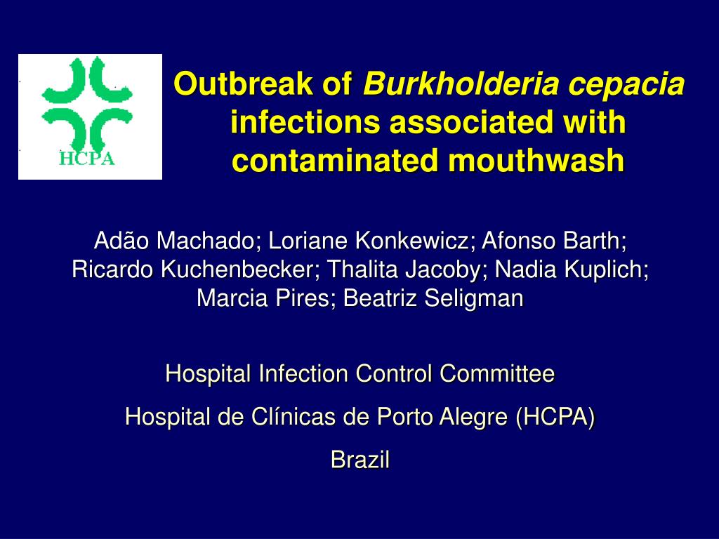 Outbreak of Burkholderia cepacia infections associated with contaminated mouthwash Adão Machado; Loriane Konkewicz; Afonso Barth; Ricardo Kuchenbecker; Thalita Jacoby; Nadia Kuplich; Marcia Pires; Beatriz Seligman Hospital Infection Control Committee Hospital de Clínicas de Porto Alegre (HCPA) Brazil