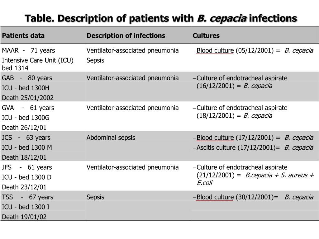 The outbreak • Observational study. • In December 2001 five B. cepacia nosocomial infections in the medical-surgical Intensive Care Unit and one additional case in a surgical ward were identified. None of these patients had cystic fibrosis or immunodepression. • Infection control measures and epidemiological investigation were implemented.