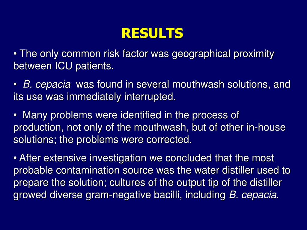 RESULTS • The only common risk factor was geographical proximity between ICU patients. • B. cepacia was found in several mouthwash solutions, and its use was immediately interrupted. • Many problems were identified in the process of production, not only of the mouthwash, but of other in-house solutions; the problems were corrected. • After extensive investigation we concluded that the most probable contamination source was the water distiller used to prepare the solution; cultures of the output tip of the distiller growed diverse gram-negative bacilli, including B. cepacia.