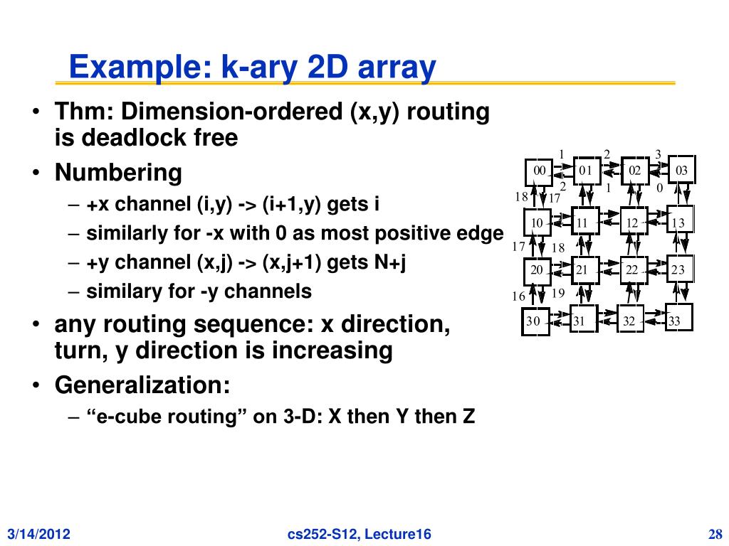 Example: k-ary 2D array • Thm: Dimension-ordered (x,y) routing is deadlock free • Numbering • +x channel (i,y) -> (i+1,y) gets i • similarly for -x with 0 as most positive edge • +y channel (x,j) -> (x,j+1) gets N+j • similary for -y channels • any routing sequence: x direction, turn, y direction is increasing • Generalization: • “e-cube routing” on 3-D: X then Y then Z