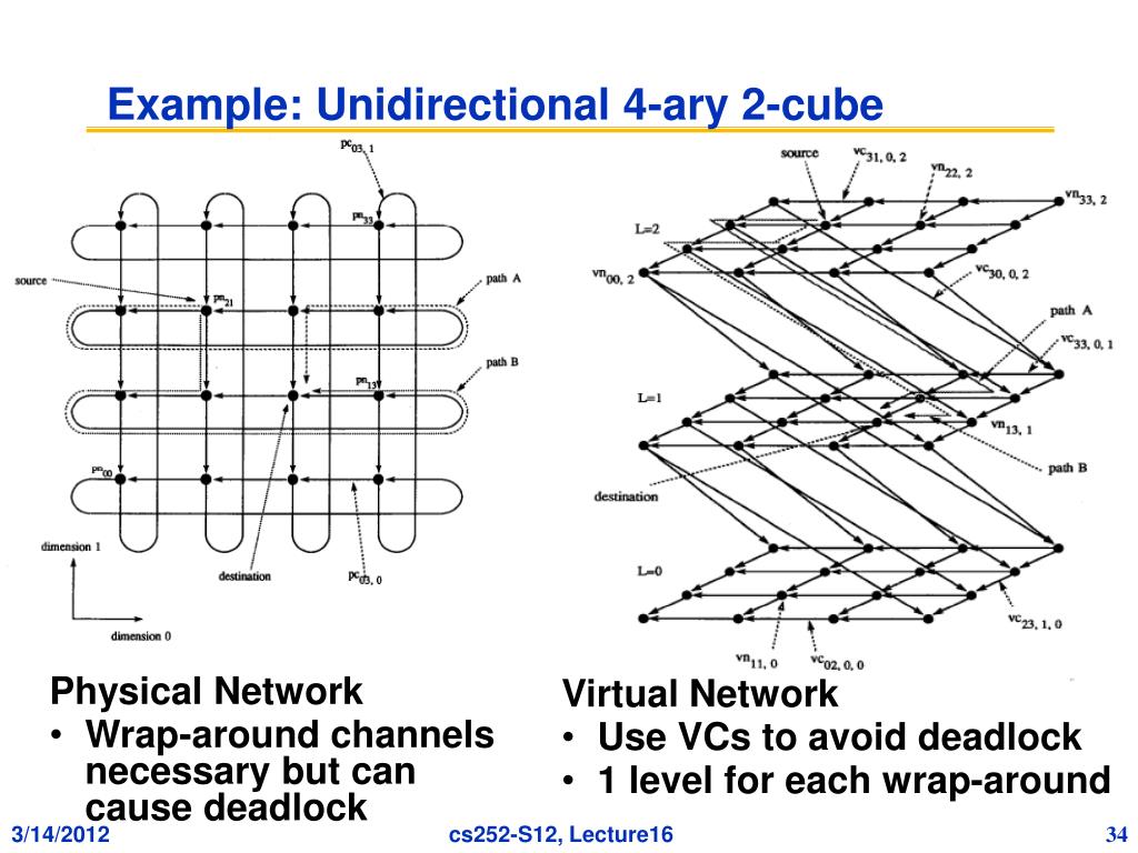 Example: Unidirectional 4-ary 2-cube Physical Network • Wrap-around channels necessary but cancause deadlock Virtual Network • Use VCs to avoid deadlock • 1 level for each wrap-around