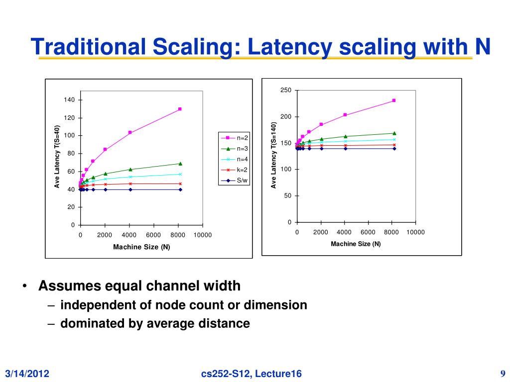 Traditional Scaling: Latency scaling with N • Assumes equal channel width • independent of node count or dimension • dominated by average distance
