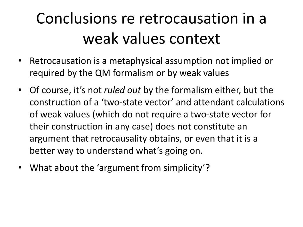 Conclusions re retrocausation in a weak values context • Retrocausation is a metaphysical assumption not implied or required by the QM formalism or by weak values • Of course, it’s not ruled out by the formalism either, but the construction of a ‘two-state vector’ and attendant calculations of weak values (which do not require a two-state vector for their construction in any case) does not constitute an argument that retrocausality obtains, or even that it is a better way to understand what’s going on. • What about the ‘argument from simplicity’?