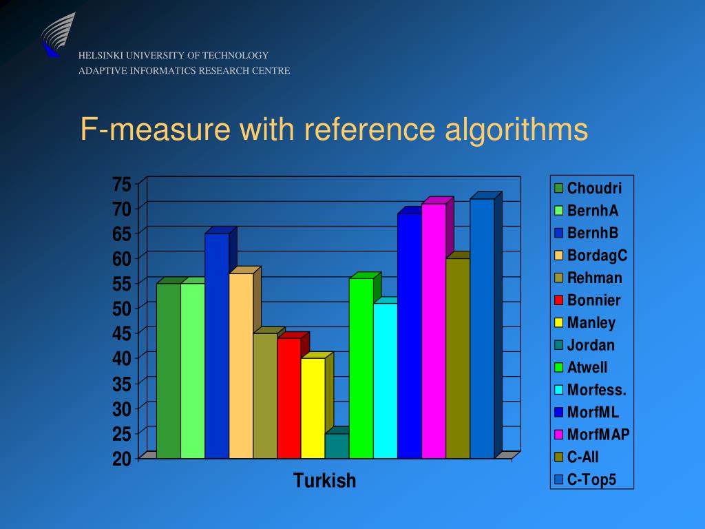 Competition 1: Word segmentation • Two samples : boule_vard , cup_bearer_s‘ • Gold standard: boulevard , cup_bear_er_s_‘ • 2 correct hits (H), 1 insertion (I), 2 deletions (D) • Precision = H / (H + I) = 2 / (2 + 1) = 0.67 • Recall = H / (H + D) = 2 / (2 + 2) = 0.50 • F-Measure = harmonic mean of precision and recall = 2H / (2H + I + D) = 4 / (4 + 1 + 2) = 0.57 • A secret (random)10% subset of words evaluated • Morfessor Baseline: 54.2% FI, 51.3% TR, 66.0 EN