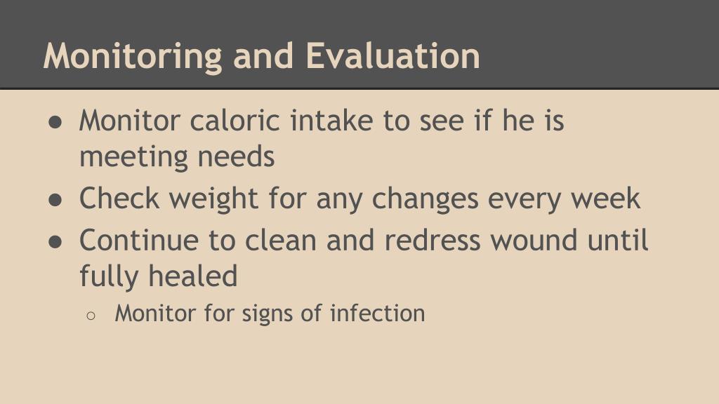 Monitoring and Evaluation • Monitor caloric intake to see if he is meeting needs • Check weight for any changes every week • Continue to clean and redress wound until fully healed • Monitor for signs of infection