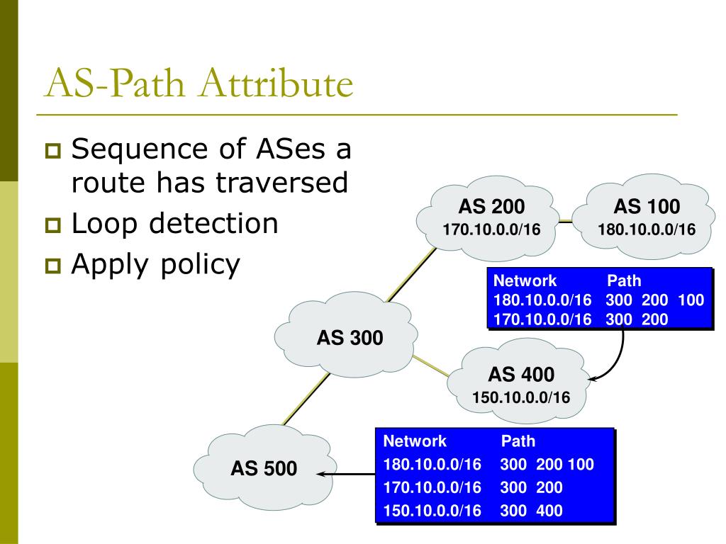 AS-Path Attribute • Sequence of ASes a route has traversed • Loop detection • Apply policy AS 200 AS 100 170.10.0.0/16 180.10.0.0/16 Network Path 180.10.0.0/16 300 200 100 170.10.0.0/16 300 200 AS 300 AS 400 150.10.0.0/16 Network Path 180.10.0.0/16 300 200 100 170.10.0.0/16 300 200 150.10.0.0/16 300 400 AS 500