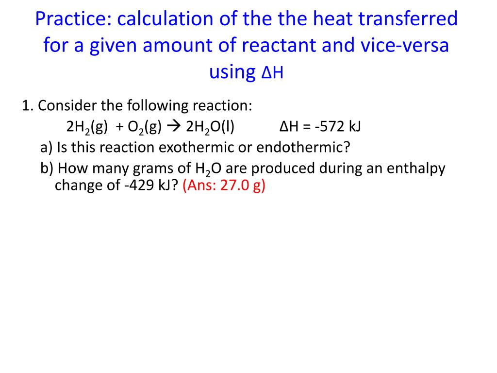 Practice: calculation of the the heat transferred for a given amount of reactant and vice-versa using ΔH 1. Consider the following reaction: 2H2(g) + O2(g) 2H2O(l) ΔH = -572 kJ a) Is this reaction exothermic or endothermic? b) How many grams of H2O are produced during an enthalpy change of -429 kJ? (Ans: 27.0 g)