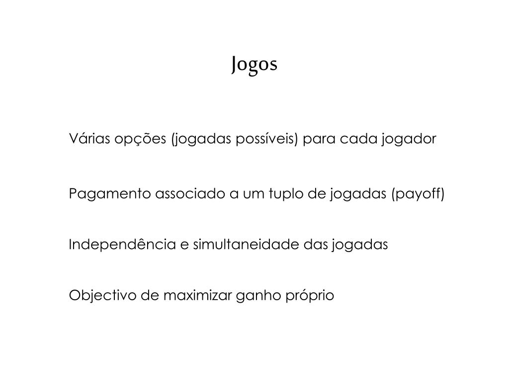 Jogos Várias opções (jogadas possíveis) para cada jogador Pagamento associado a um tuplo de jogadas (payoff) Independência e simultaneidade das jogadas Objectivo de maximizar ganho próprio