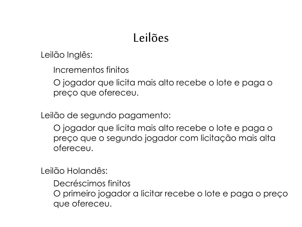 Leilões Leilão Inglês: Incrementos finitos O jogador que licita mais alto recebe o lote e paga o preço que ofereceu. Leilão de segundo pagamento: O jogador que licita mais alto recebe o lote e paga o preço que o segundo jogador com licitação mais alta ofereceu. Leilão Holandês: Decréscimos finitos O primeiro jogador a licitar recebe o lote e paga o preço que ofereceu.