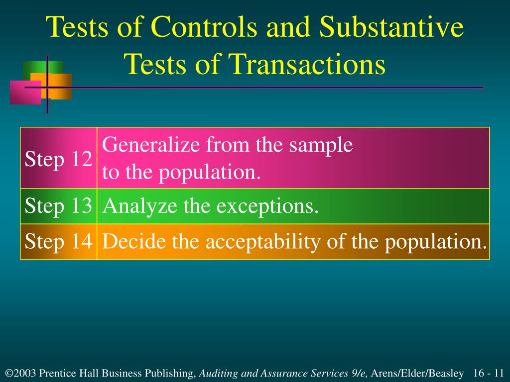Tests of Controls and SubstantiveTests of Transactions Step 12 Generalize from the sample to the population. Step 13 Analyze the exceptions. Step 14 Decide the acceptability of the population.