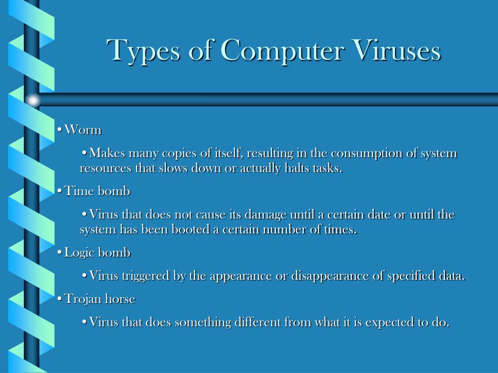 Types of Computer Viruses • Worm • Makes many copies of itself, resulting in the consumption of system resources that slows down or actually halts tasks. • Time bomb • Virus that does not cause its damage until a certain date or until the system has been booted a certain number of times. • Logic bomb • Virus triggered by the appearance or disappearance of specified data. • Trojan horse • Virus that does something different from what it is expected to do.
