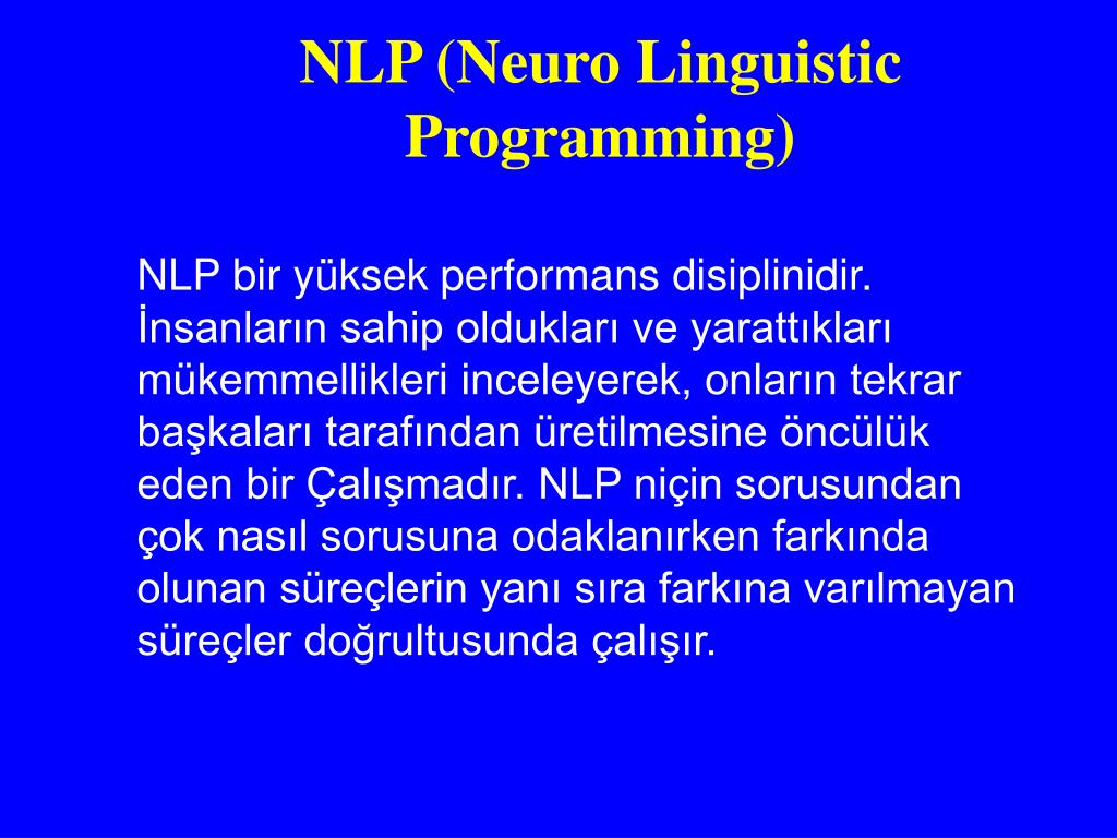 NLP (Neuro Linguistic Programming) NLP bir yüksek performans disiplinidir. İnsanların sahip oldukları ve yarattıkları mükemmellikleri inceleyerek, onların tekrar başkaları tarafından üretilmesine öncülük eden bir Çalışmadır. NLP niçin sorusundan çok nasıl sorusuna odaklanırken farkında olunan süreçlerin yanı sıra farkına varılmayan süreçler doğrultusunda çalışır.