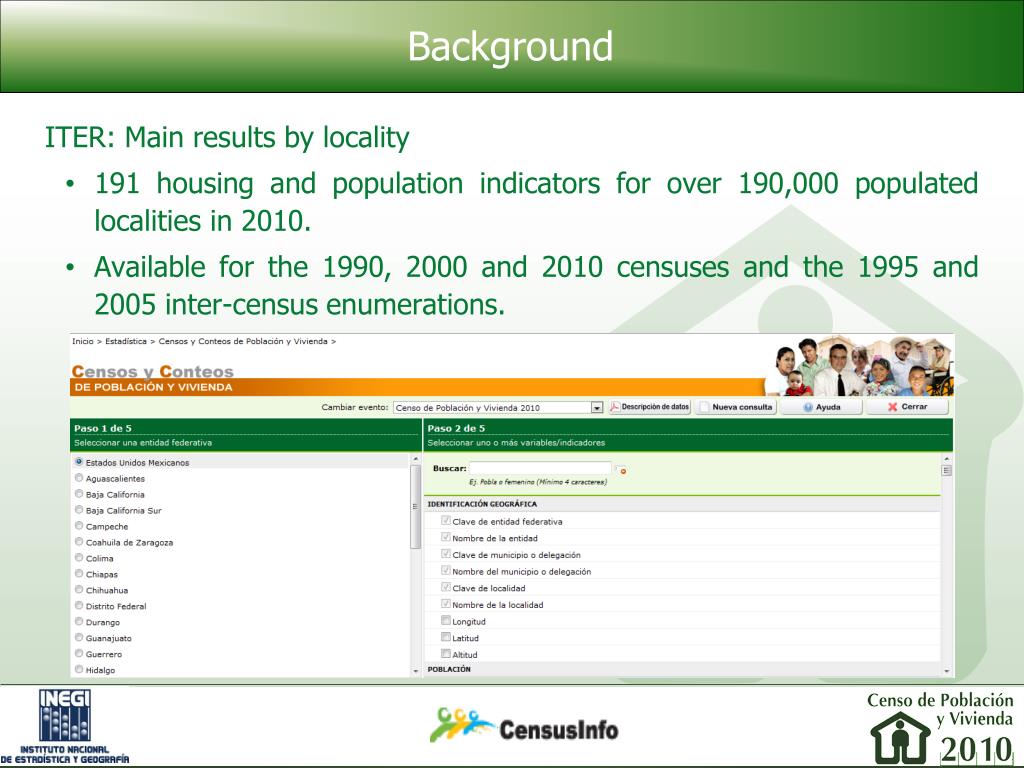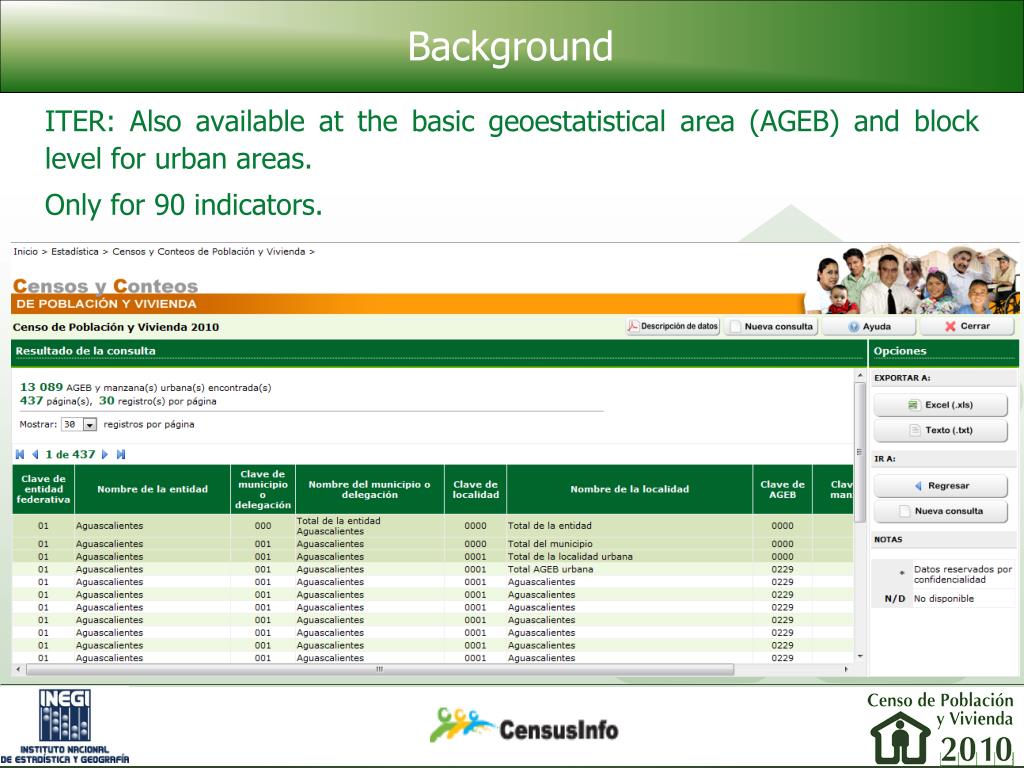 Background • ITER: Also available at the basic geoestatistical area (AGEB) and block level for urban areas. • Only for 90 indicators.