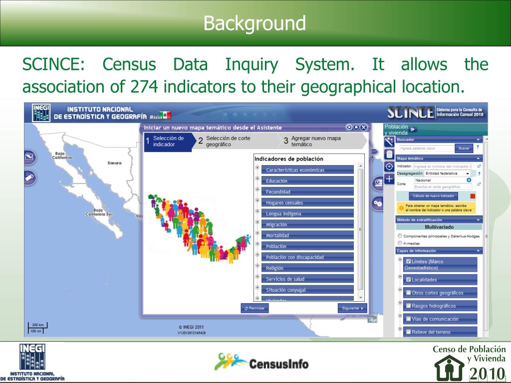Background • SCINCE: Census Data Inquiry System. It allows the association of 274 indicators to their geographical location.