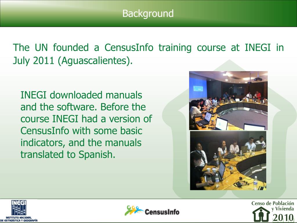 Background The UN founded a CensusInfo training course at INEGI in July 2011 (Aguascalientes). INEGI downloaded manuals and the software. Before the course INEGI had a version of CensusInfo with some basic indicators, and the manuals translated to Spanish.
