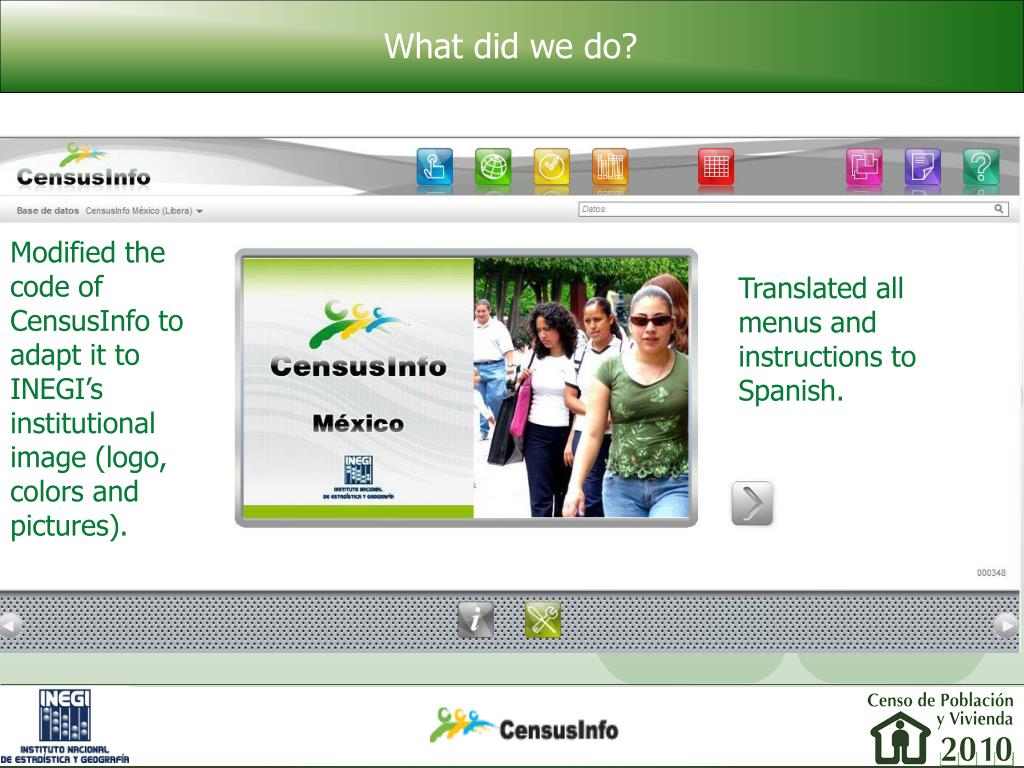 What did we do? Modified the code of CensusInfo to adapt it to INEGI’s institutional image (logo, colors and pictures). Translated all menus and instructions to Spanish.
