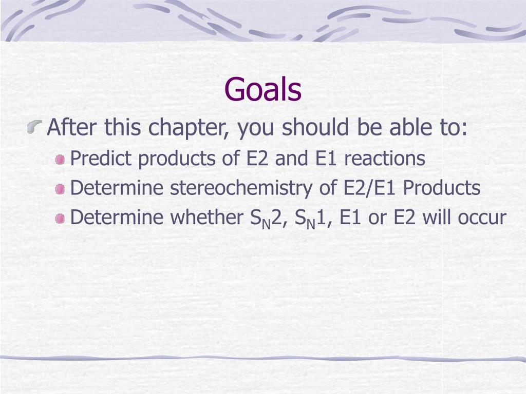 Goals • After this chapter, you should be able to: • Predict products of E2 and E1 reactions • Determine stereochemistry of E2/E1 Products • Determine whether SN2, SN1, E1 or E2 will occur